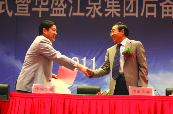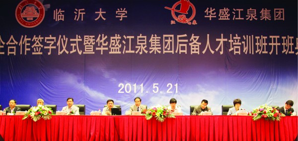 2011年5月21日,臨沂大學(xué)華盛江泉集團(tuán)校企合作簽字暨華盛江泉集團(tuán)后備人才培訓(xùn)班開班盛典在江泉城舉行。出席典禮儀式并在主席臺就坐的領(lǐng)導(dǎo)有:臨沂大學(xué)校長韓延明博士,臨沂大學(xué)商學(xué)院院長、教授、許汝貞博士,臨沂大學(xué)繼續(xù)教育處處長李殿勇教授,臨沂大學(xué)商學(xué)院培訓(xùn)中心主任、王郡華教授,臨沂大學(xué)商學(xué)院刁玉柱博士,羅莊區(qū)人民政府吳漢林副區(qū)長,沈泉莊黨委于孝燕書記,沈泉莊黨委副書記、華盛江泉集團(tuán)高洪路總經(jīng)理,沈泉莊黨委副書記、華盛江泉集團(tuán)王廷寶副總經(jīng)理,以及臨沂電視臺、臨沂人民廣播電臺、臨沂日報(bào)社等新聞媒體的記者和集團(tuán)所有高管、各單位管理人員及后備人才等,共800余人出席會議。